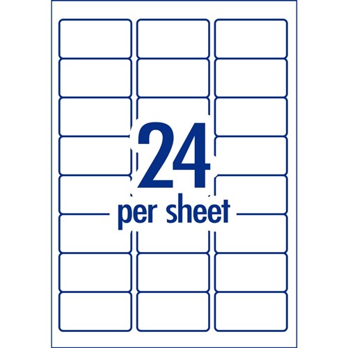 • Size: 64 x 33.8mm, 2400 labels, 100 sheets. 24 labels per sheet (24UP).