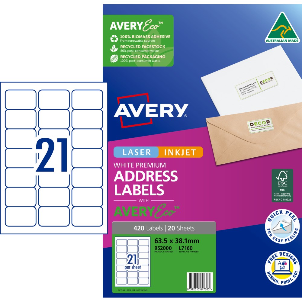 Avery Quick Peel Address Laser Labels White L7160 63.5x38.1mm 21UP 420 Labels 20 Sheets