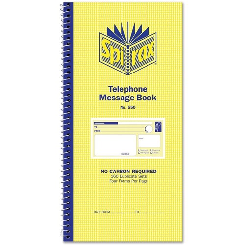Spirax 550 Telephone Message Book Carbonless 4 Per Page 160 Duplicate Sets Side Opening